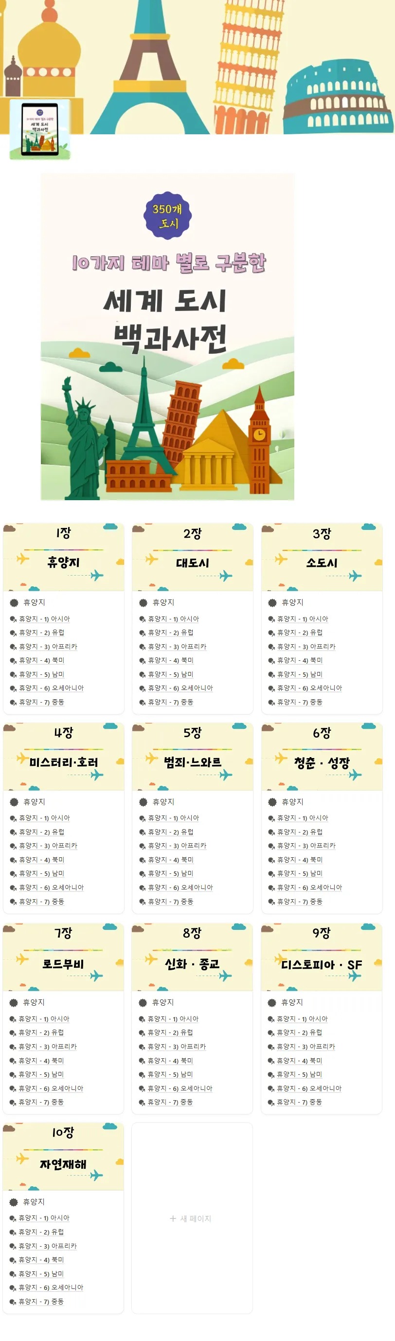 - 총 350개 도시 설명, 에세이 형식 진행