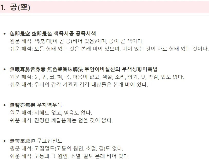 원문 해석: 공 안에는 색도 없고, 느낌, 생각, 행위, 의식도 없다.